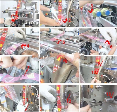 6、把以上步驟完成后,包裝膜繼續(xù)往下拉,拉到立式顆粒包裝機的象鼻式成型器上,插入圖片標(biāo)示8的位置上,然后繼續(xù)通過標(biāo)示9和10的位置來,再把包裝膜一直拉至象鼻式成型器的最底端;