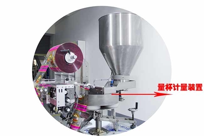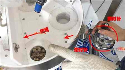 顆粒包裝機量杯計量裝置上的手柄往順時針方向扭動,扭動至物料與萬能量杯平齊,如果52g珍珠丸子低于萬能量杯,那么把量杯計量裝置上的手柄往逆時針方向扭動。調(diào)節(jié)好后,量杯計量裝置在旋轉(zhuǎn)的時候物料經(jīng)過擋板的時候,沒有卡料就證明調(diào)節(jié)好了。如下圖